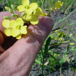 An weed in the broccoli family with finely dissected leaves and an upright, branching habit. Flower clusters are at the ends of stems. Grows about 2 ft. tall. One of the earliest weeds to bloom.