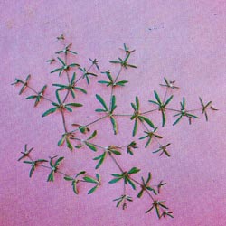Summer annual. Stems green, smooth. Branches along ground in all directions from swollen nodes, forming flat mats. Smooth, tongue like leaves in spread clusters of five to six at each joint. Flowers small, white Seed is orange-red. Found in cultivated soils.
