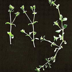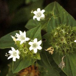 A low-growing, multi-branched plant with small oval leaves and tiny, star-like flowers. Both leaves and stems are hairy.