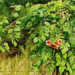 Perennial woody vine. Spreads by seed and roots. Stems smooth, 20 to 40 feet long. Leaves opposite,6 inches long, compound, with 7 to 11 leaflets. Flowers funnel- or trumpet-shaped, large, color orange to scarlet, in short- stemmed clusters. Seed pod four to six inches long, round but flattened on two sides, slightly curved. Found in fence rows and fields.