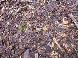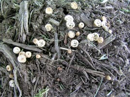 If you deal with shredded hardwood mulch in a landscape, sooner or later you’re going to have slime mold. It normally starts as a wet-yellow or wet-orange blob on the top of a mulched bed, then hardens and turns tan and becomes a brown pile of dust. While the wet stage lasts 24-36 hours, the hardened, brown-spore stage can last a month. The slime mold is fried and eaten by natives of Veracruz, Mexico, called “caca de luna”. In Austin it’s almost always associated with shredded hardwood mulches. It gets energy from organic matter below the soil line rather than from the sun, like other plants. If a fungus feeds on living organic matter, it is called parasitic. If it feeds on non-living organic matter, it’s called saprophytic. Slime mold shows high levels of organic matter trying to do something and you don’t need to control it. If you do, you can control it by flipping it over and soaking the area with a fungicide like Consan. Once it’s dried and hard, forget about spraying it with anything. Another saprophytic fungus we are all very familiar with is slime mold. It shows up as a little area of grass that looks as if someone coated the blades with oil and then sprinkled cigarette ashes or salt and pepper on the blades. Again, Consan brushed on the blades in that area will help to suppress the mold, though it will go away on its own.